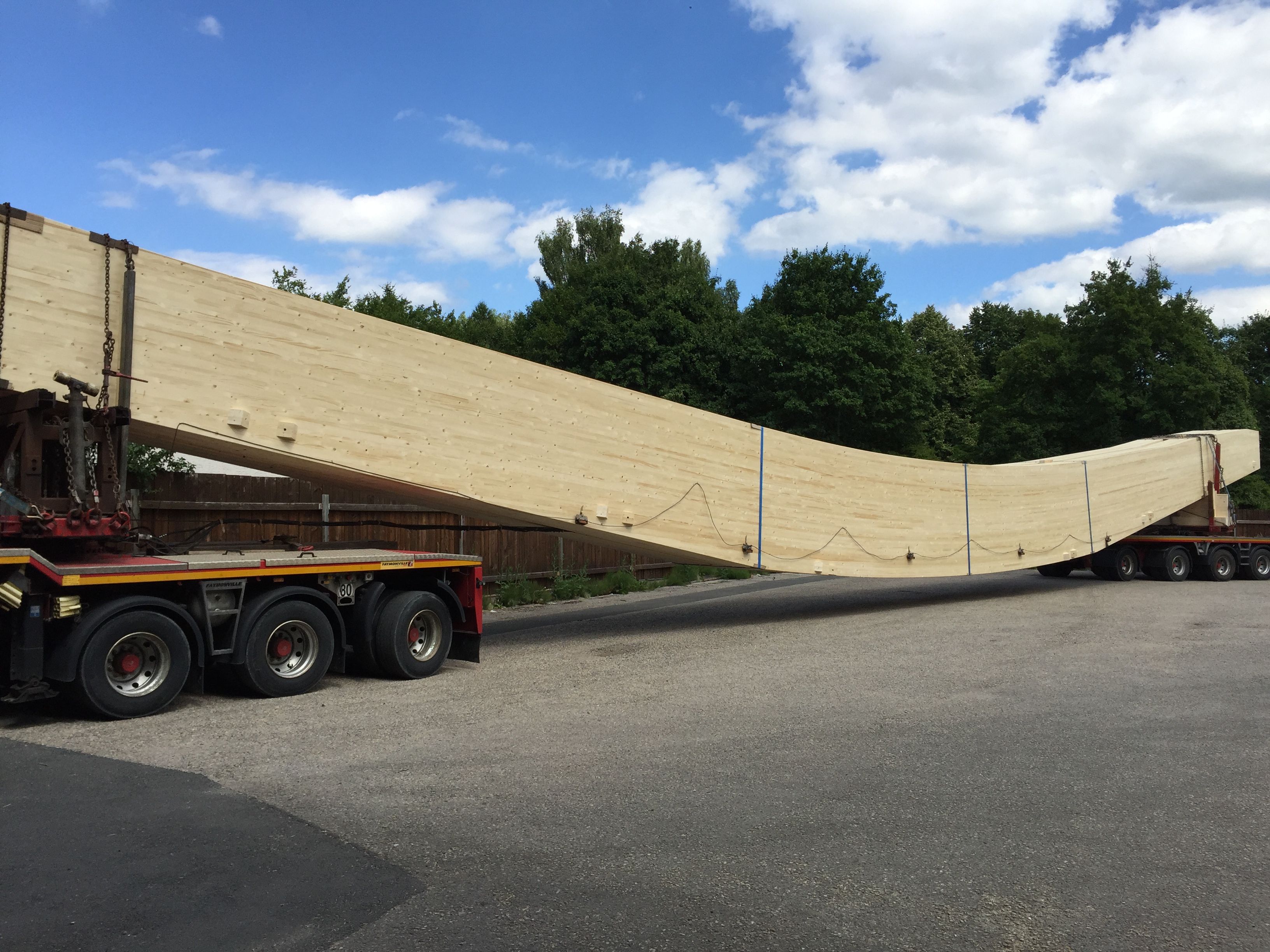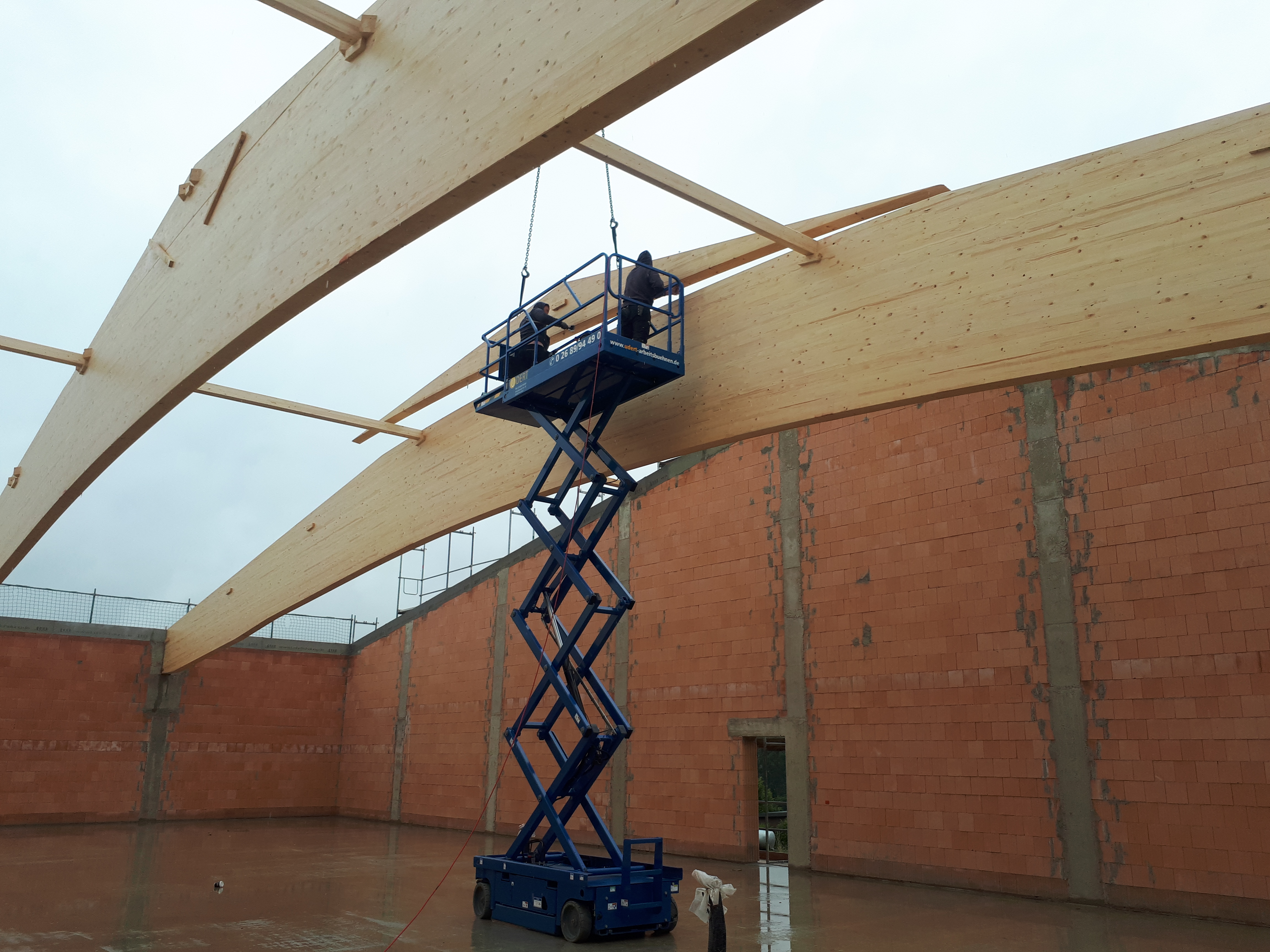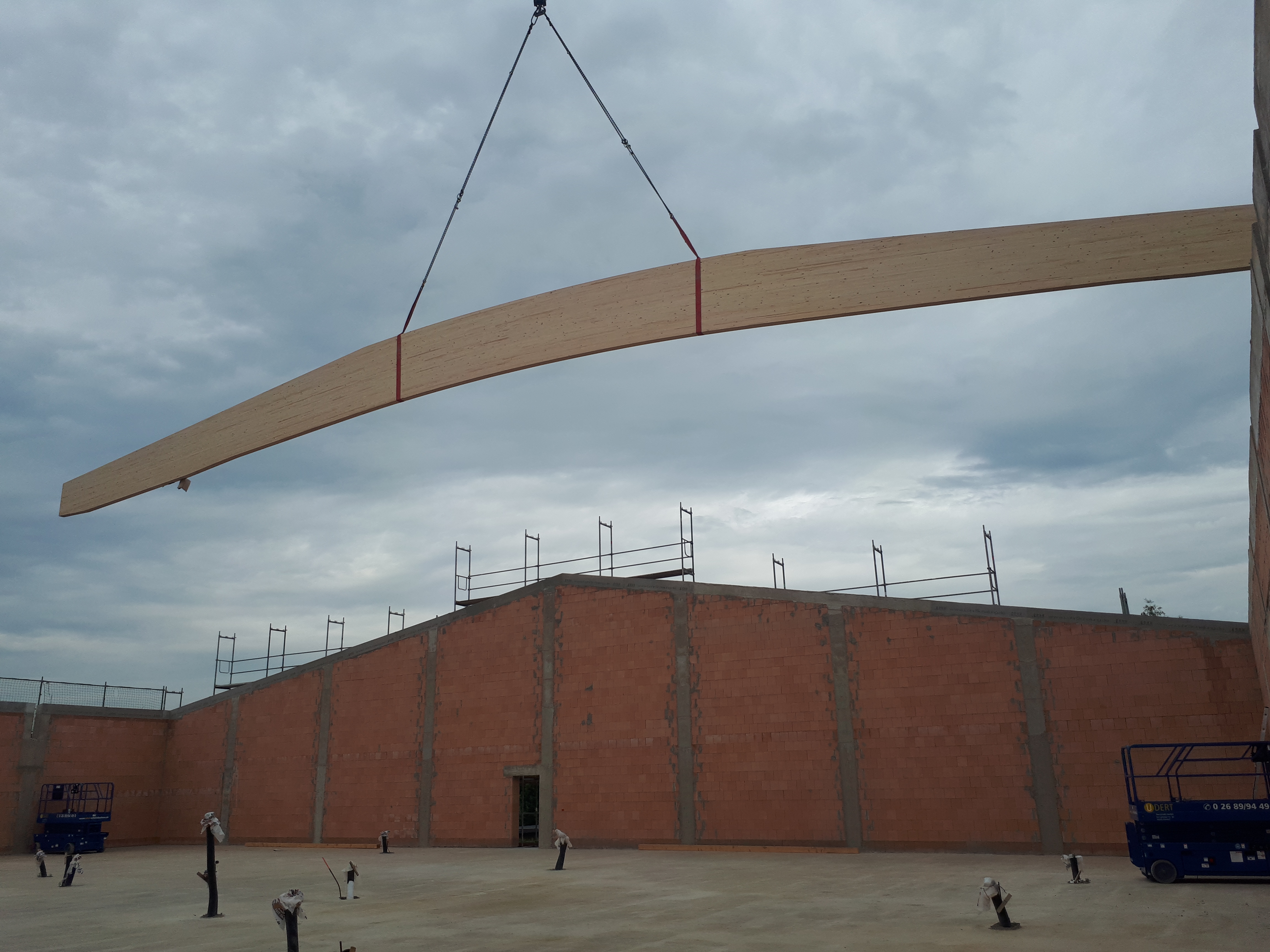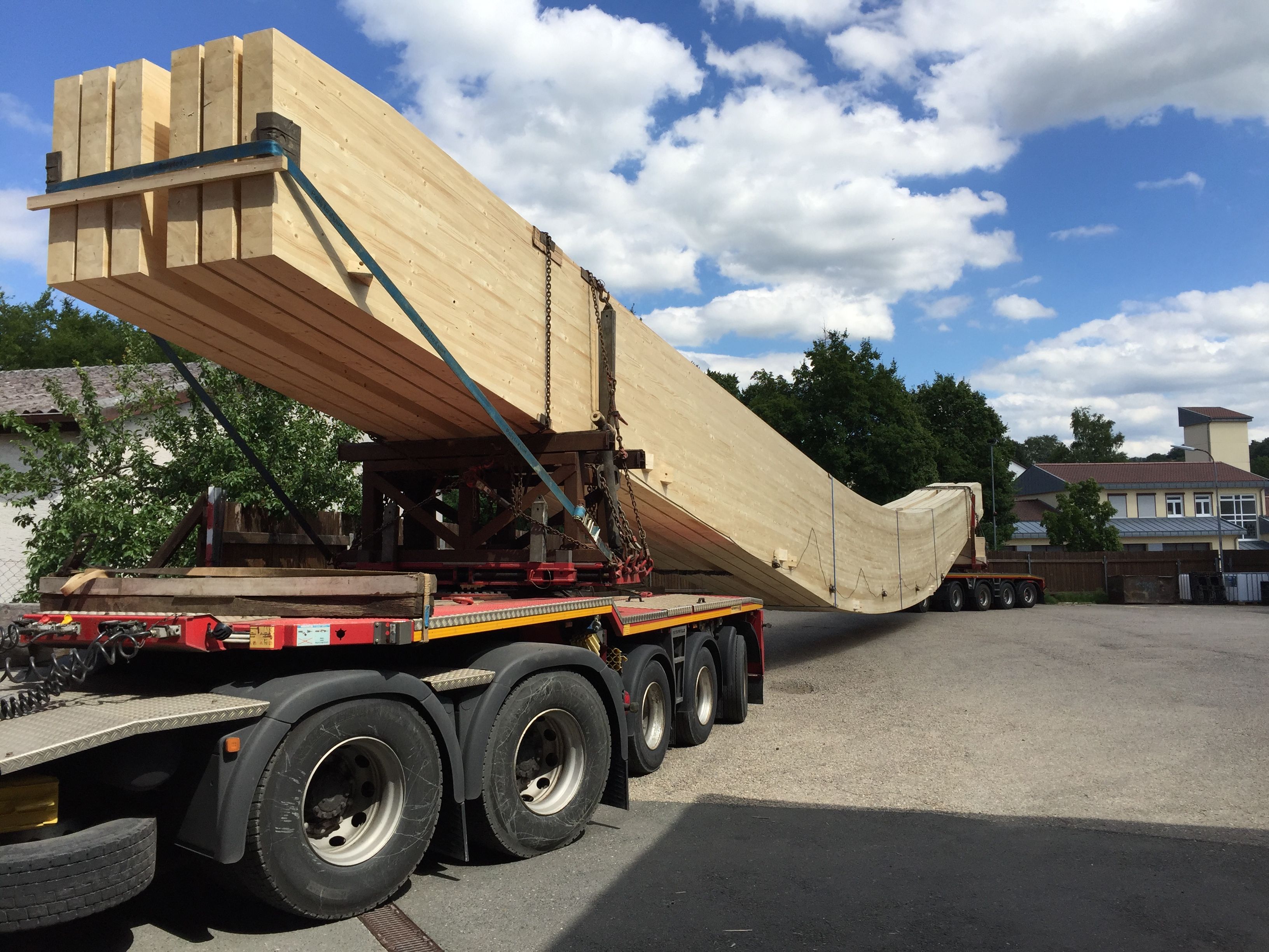 Die Montage der Dachkonstruktion konnte dann im Juni 2017 erfolgen. Die BSH-Binder haben ein Gewicht von ca. 7 to./Stück. Pro Binder wurden ca. 15 m³ Brettschichtholz benötigt. Durch die Höhe des Binders musste dieser mit einer aufgesetzten Spitze hergestellt werden.