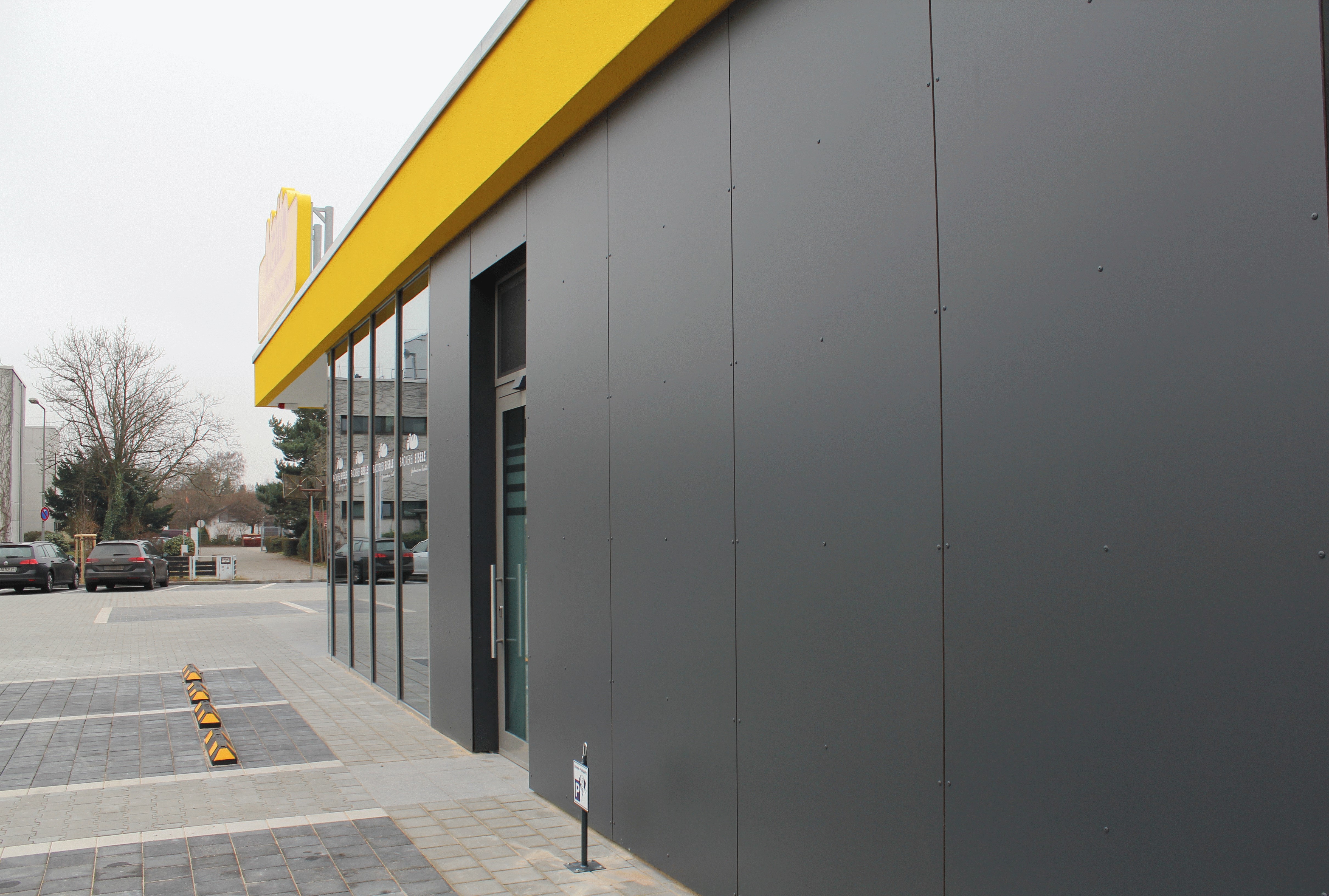 - Fassadenverkleidung am Flachdachanbau mit HPL-Platten, Fabrikat: Fundermax Exterior