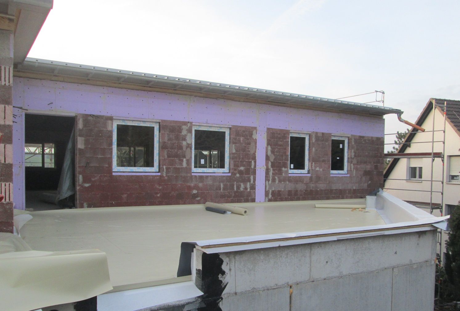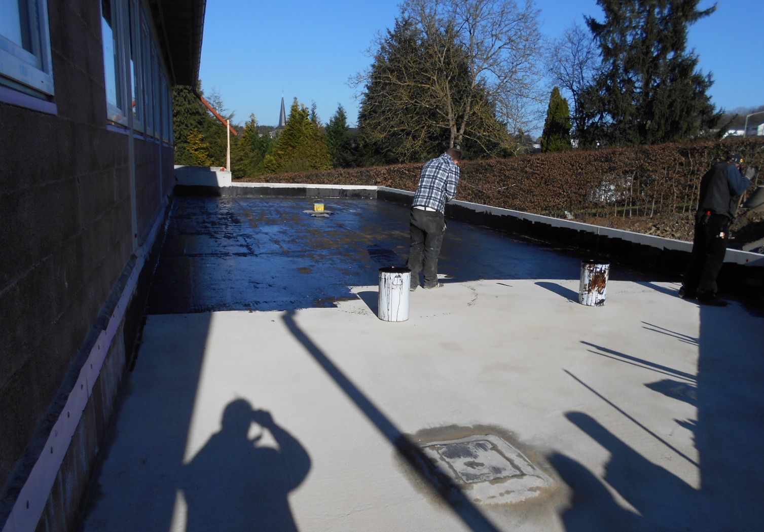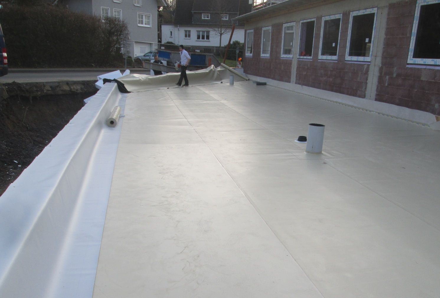 - Dachabdichtung des Flachdaches mit einer Bituminen-Dampfsperrbahn, EPS-Flachdachdämmung und Folienabdichtung für ein bauseitiges Auflastsystem