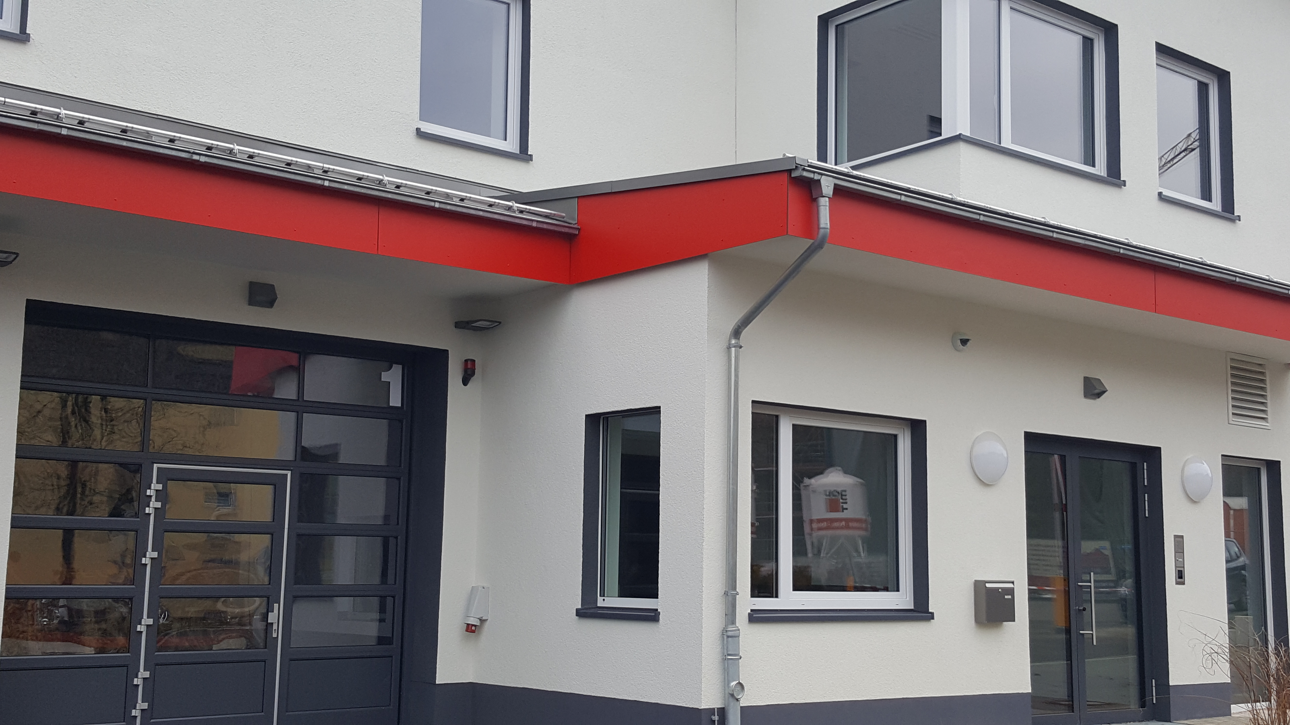 - Verkleidung des alten Schlauchturms, sowie Abdeckung des Vordaches mit beschichteten Aluminium-Scharen in Stehfalztechnik, Farbton RAL 9007
