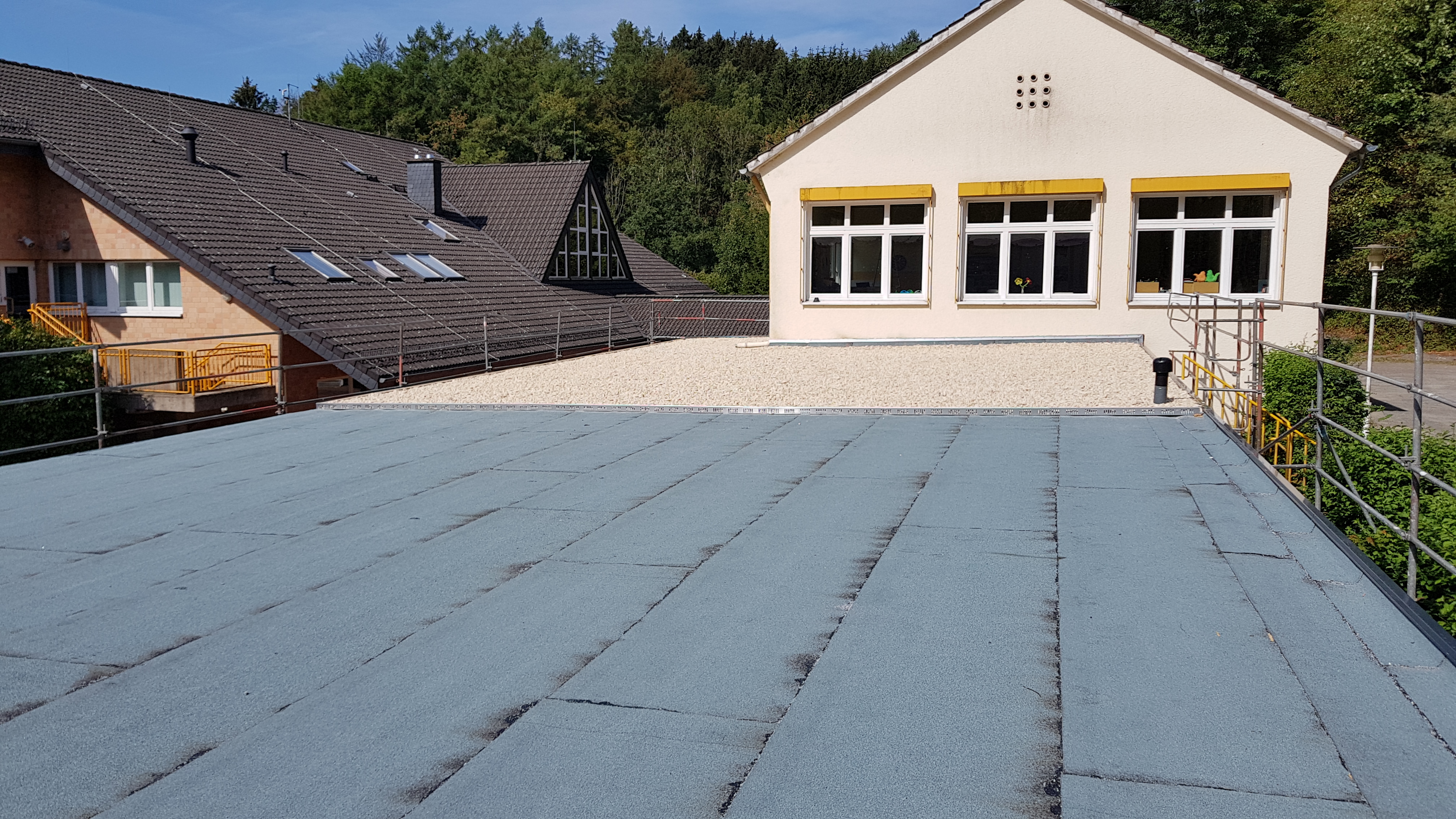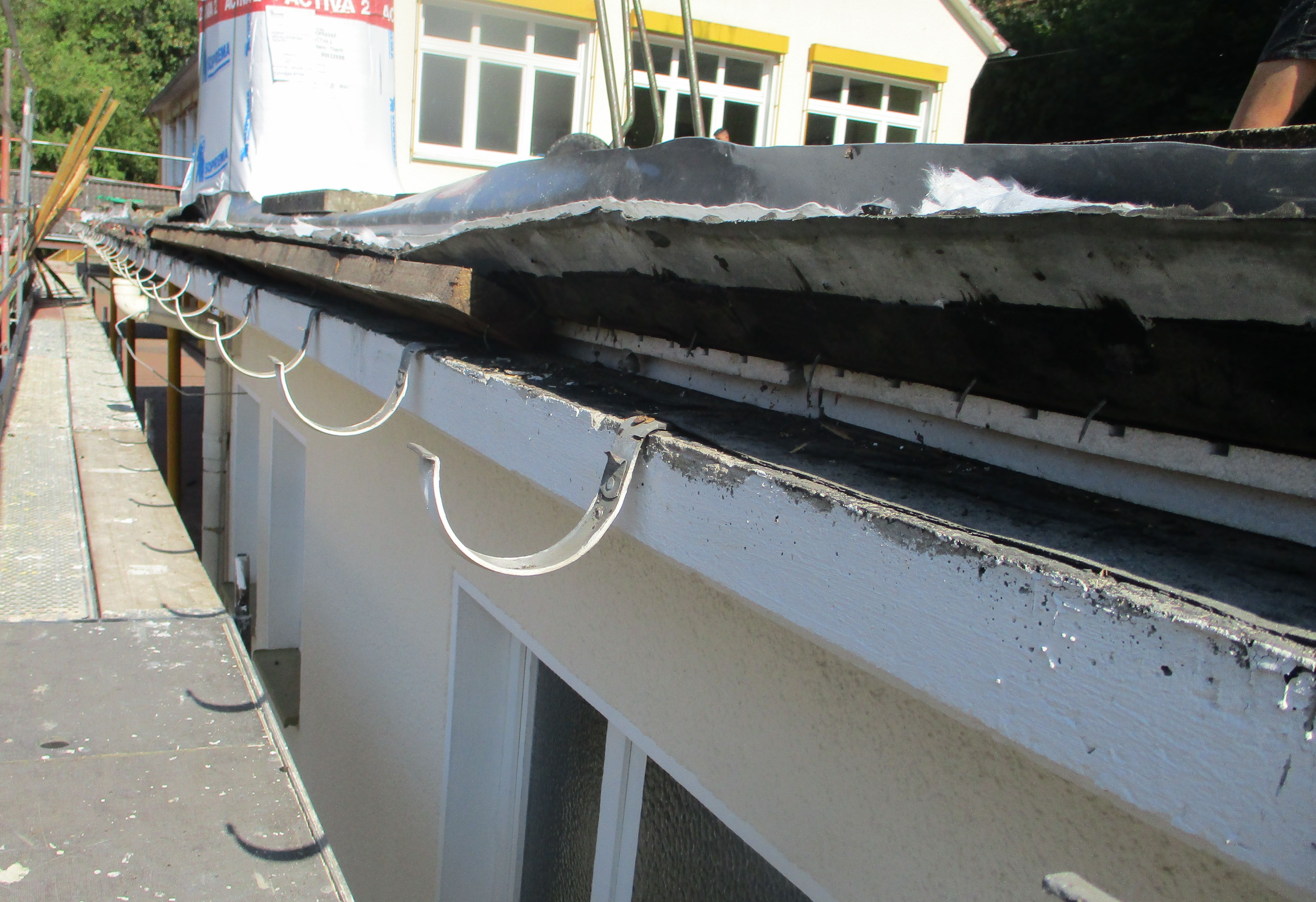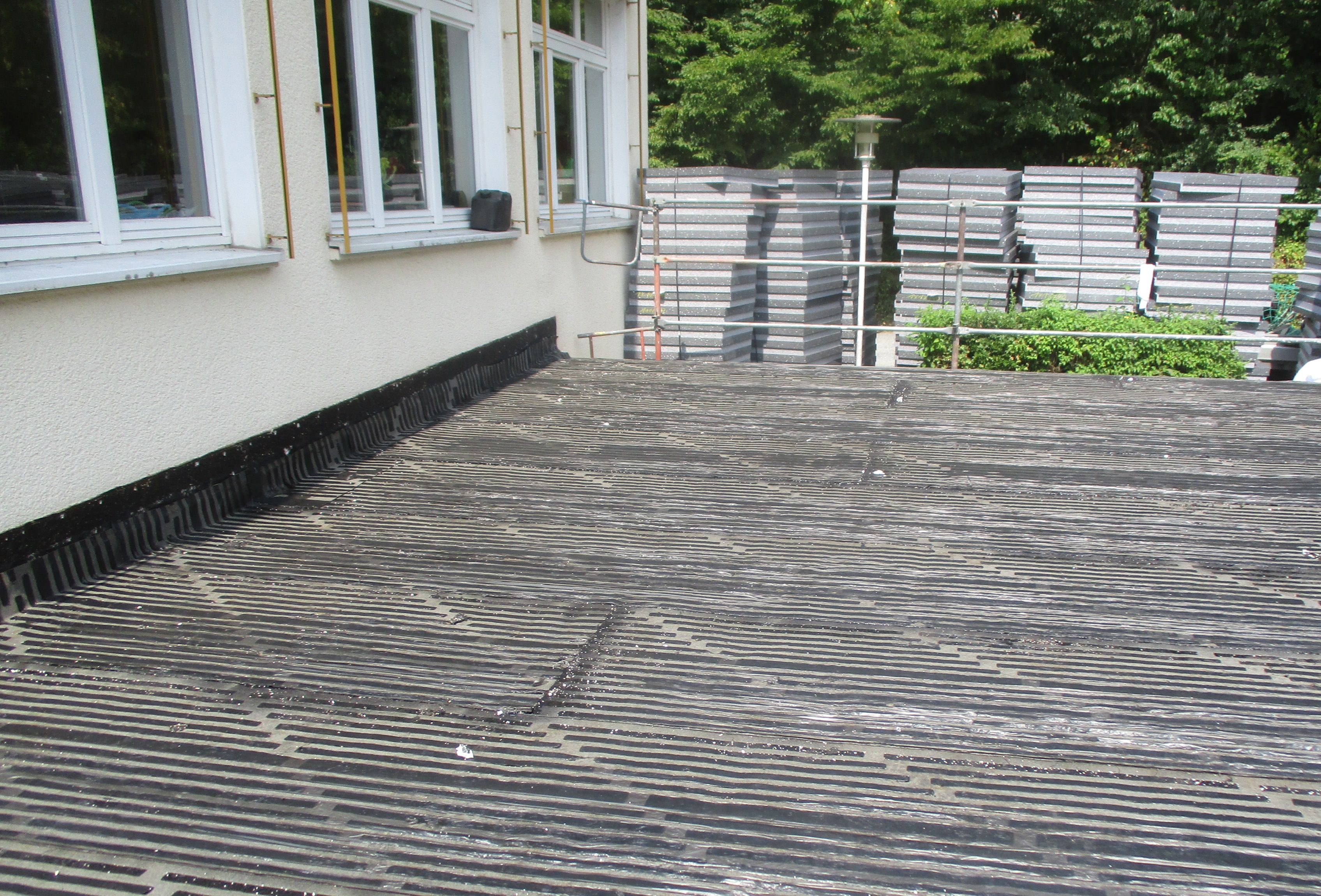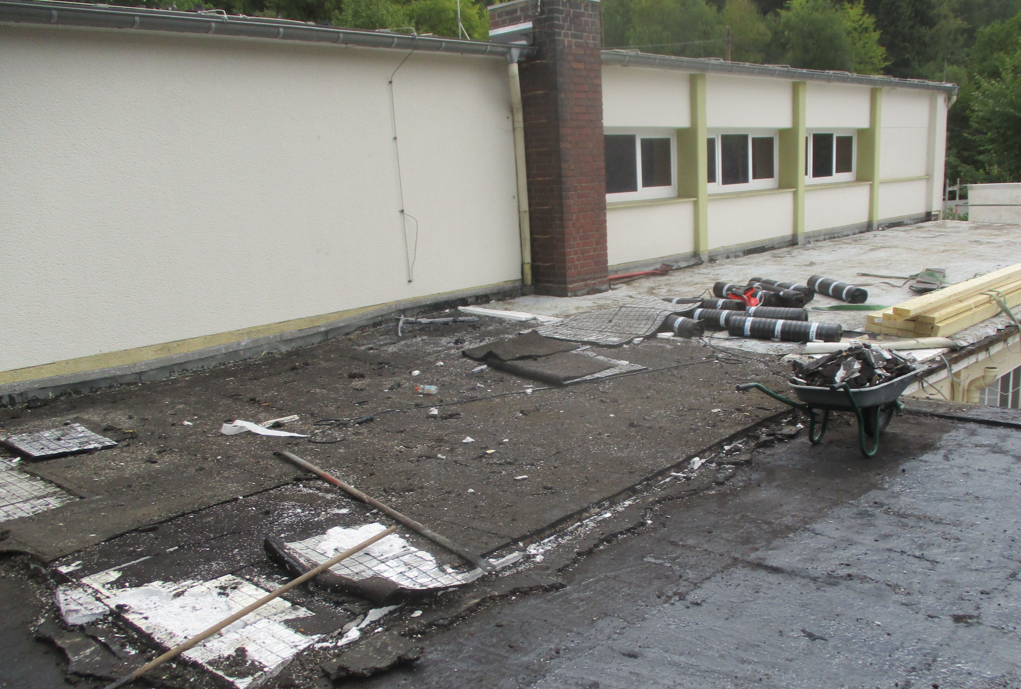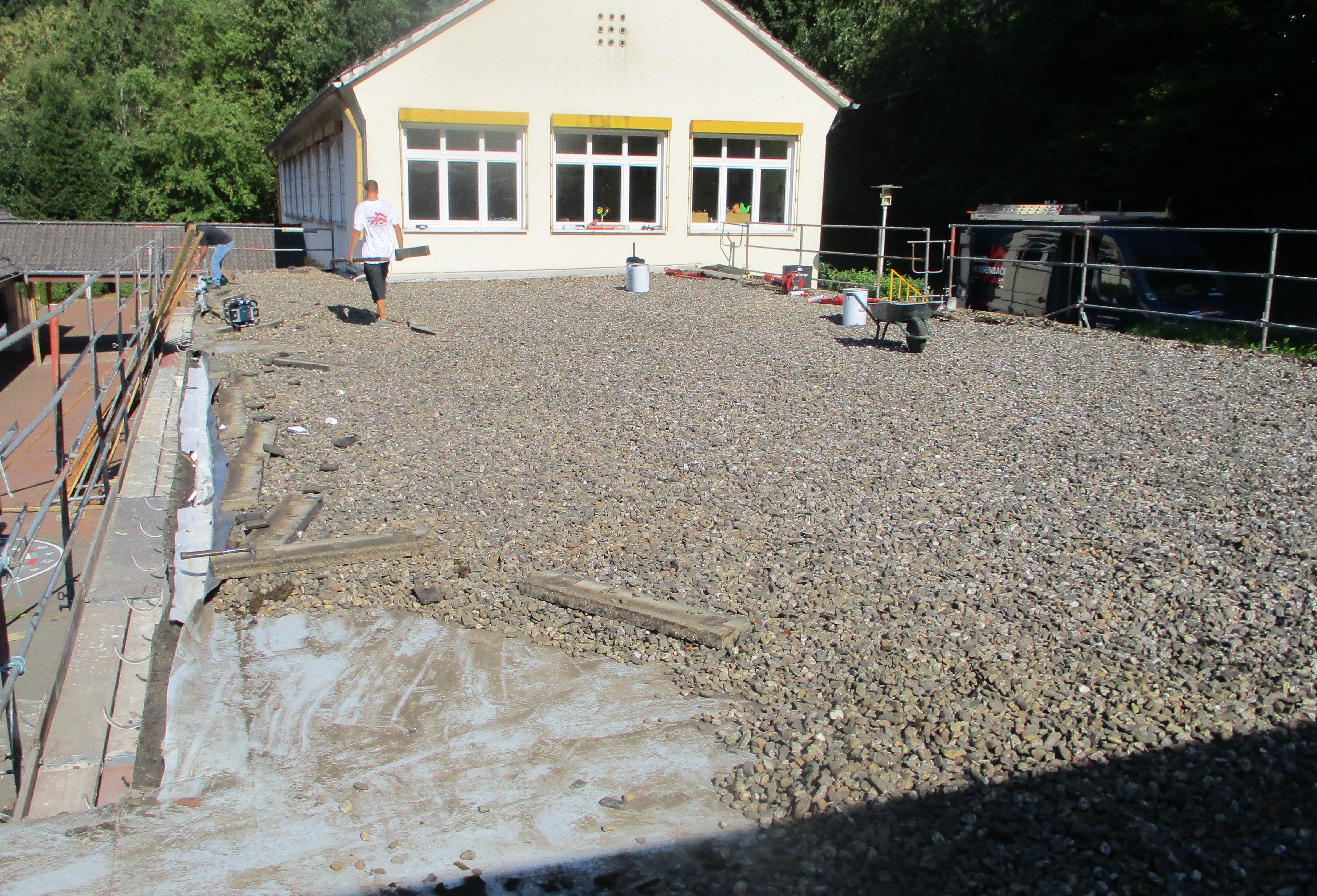 - Demontage des alten Dachaufbaus, bestehend aus einer Bitumen-Dampfsperrbahn, EPS-Dämmung und Bitumendachbahnen