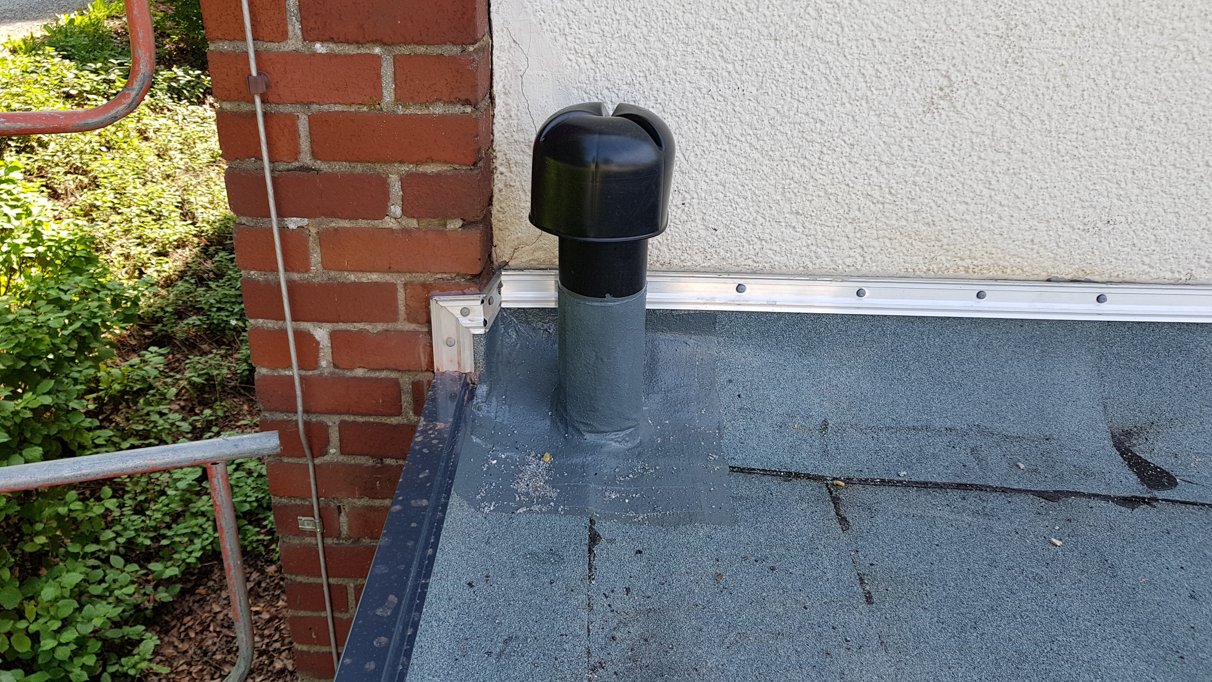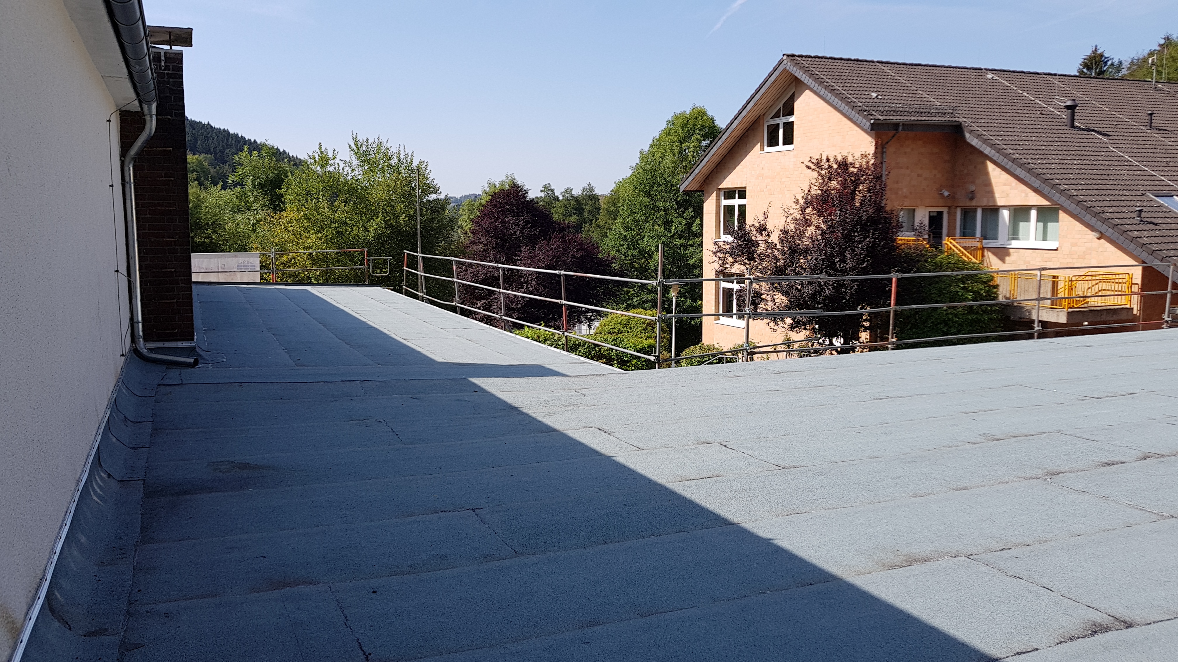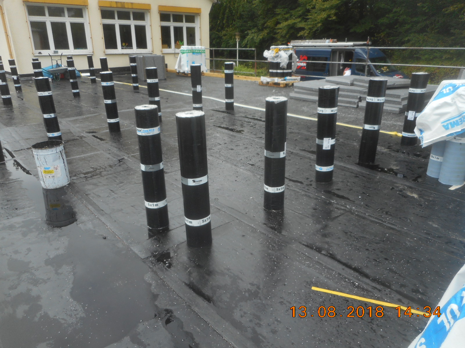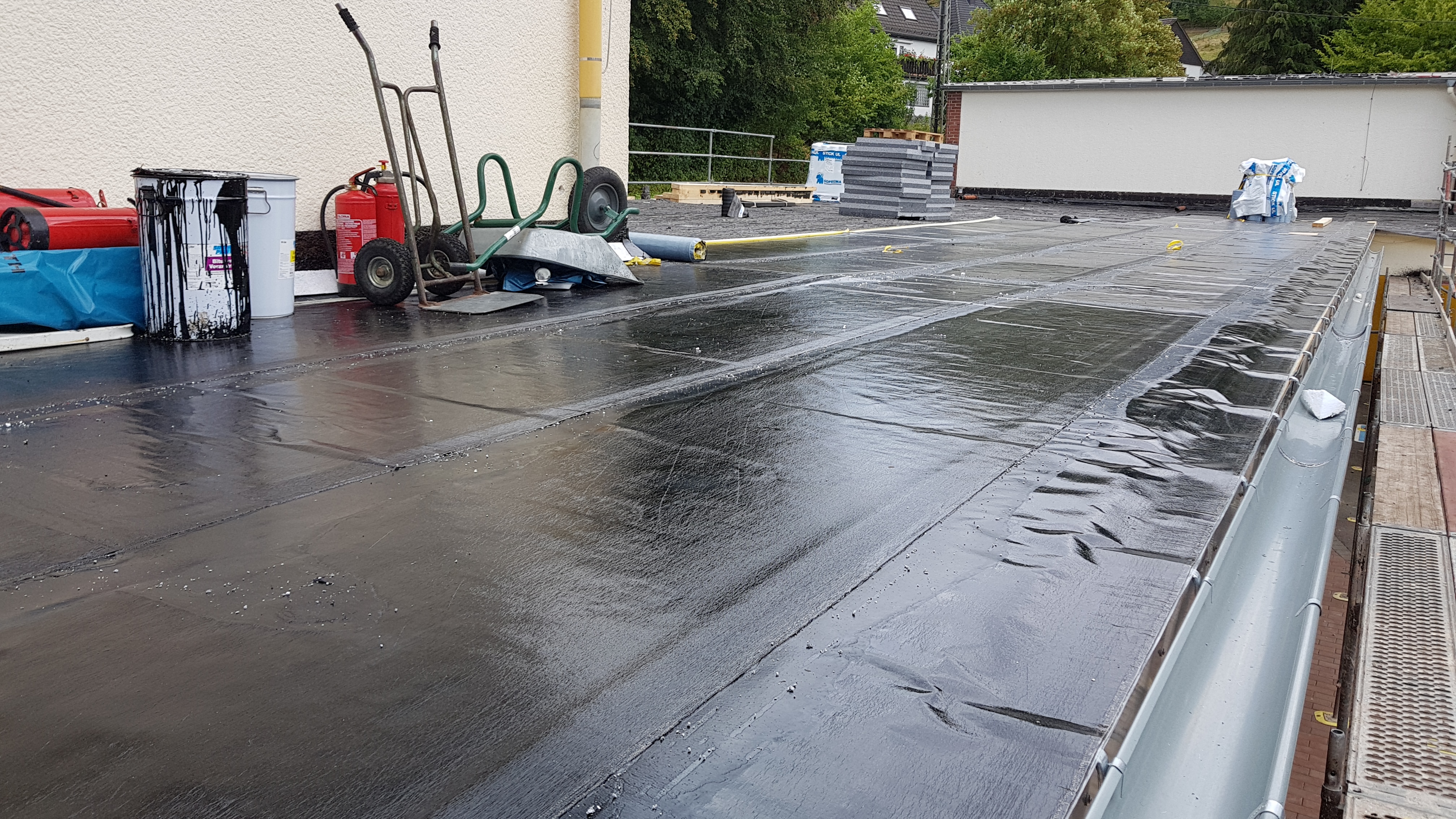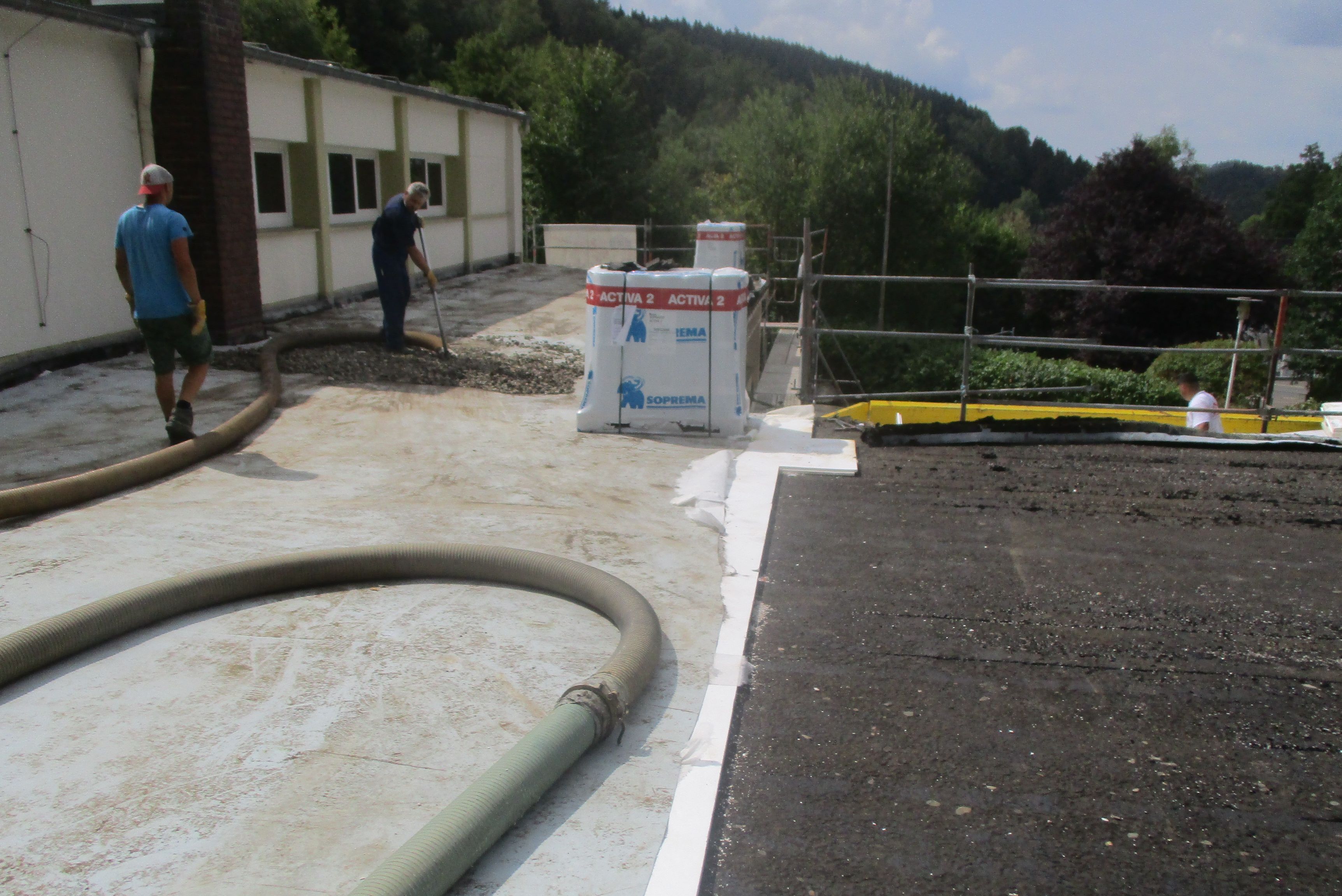- Demontage des alten Dachaufbaus, bestehend aus einer Bitumen-Dampfsperrbahn, EPS-Dämmung und Bitumendachbahnen